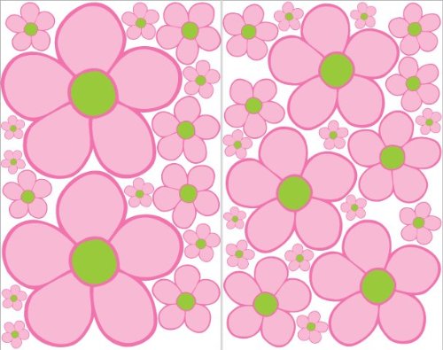 There are 36 individually cut out peel and stick pink daisies with green centers in this set on 2 panels measuring 15in by 9.5in.2 Daisies about 7.5in3 Daisies about 5in.2 Daisies about 4in.4 Daisies about 3in6 Daisies about 2.5in.and 19 Daisies that measure from 2in. to 1in. in diameterAvailable Stores